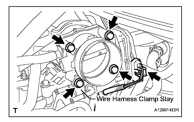 b. Install the throttle w/ motor body assembly and wire harness clamp stay to the intake air surge tank with the 4 bolts.