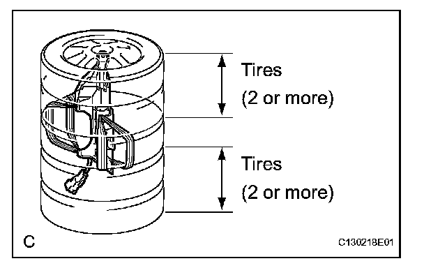1. Place at least 2 tires under the tire which the driver side knee airbag assembly is tied to.