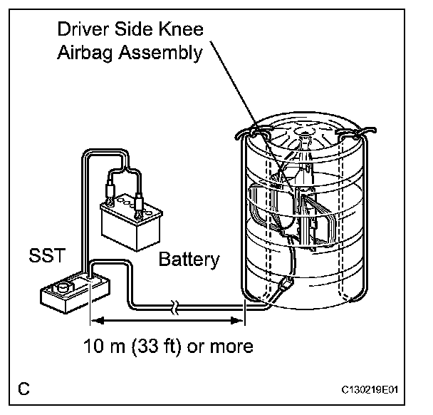 - When deploying the airbag, perform the operation at least 10 m (33 ft) away from the driver side knee airbag assembly.