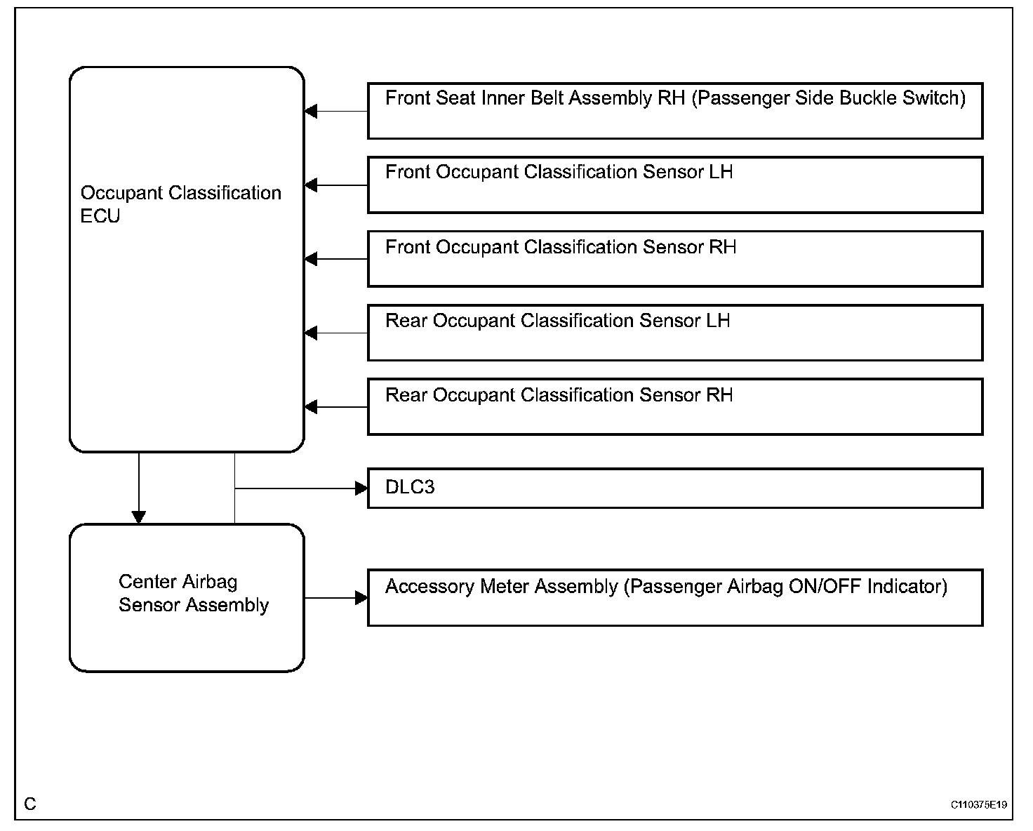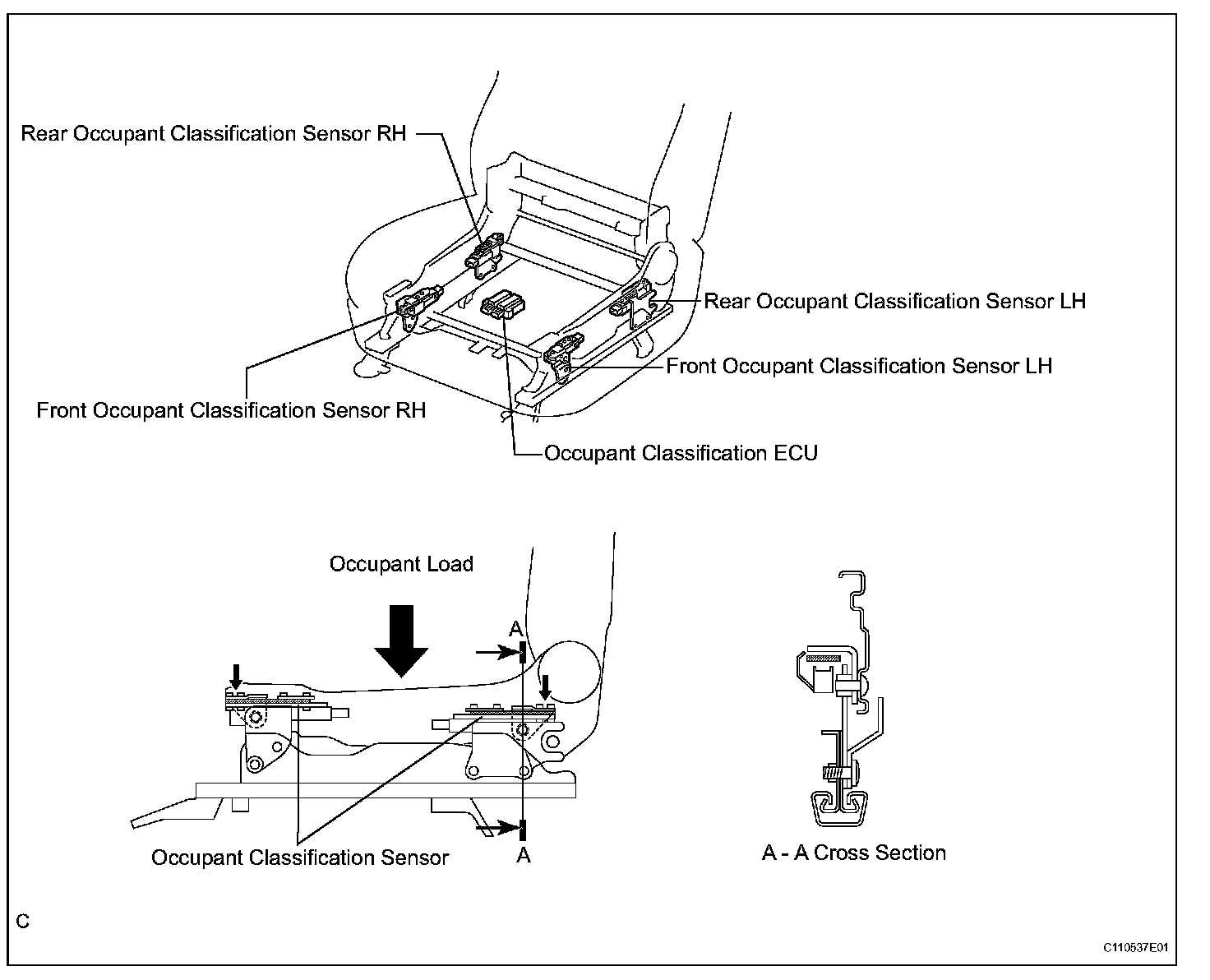 2. This system is mainly comprised of 4 occupant classification sensors that detect the load on the front passenger seat. The occupant classification ECU controls the system, and the passenger airbag ON/OFF indicator indicates the ON/OFF condition of the front passenger airbag and front passenger side-side airbag.