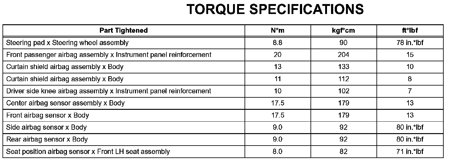 Supplemental Restraint System - Torque Specifications: