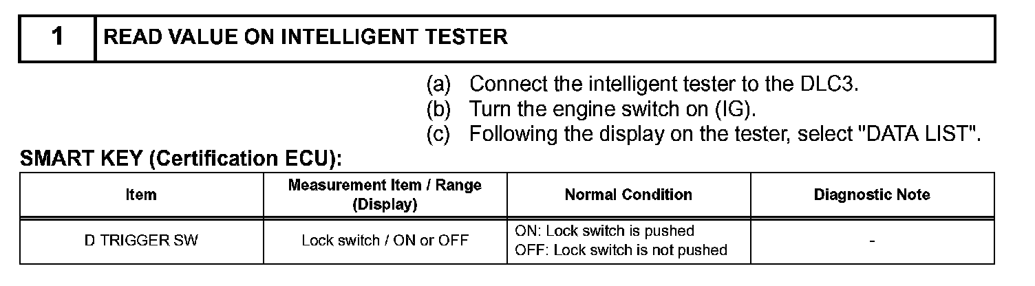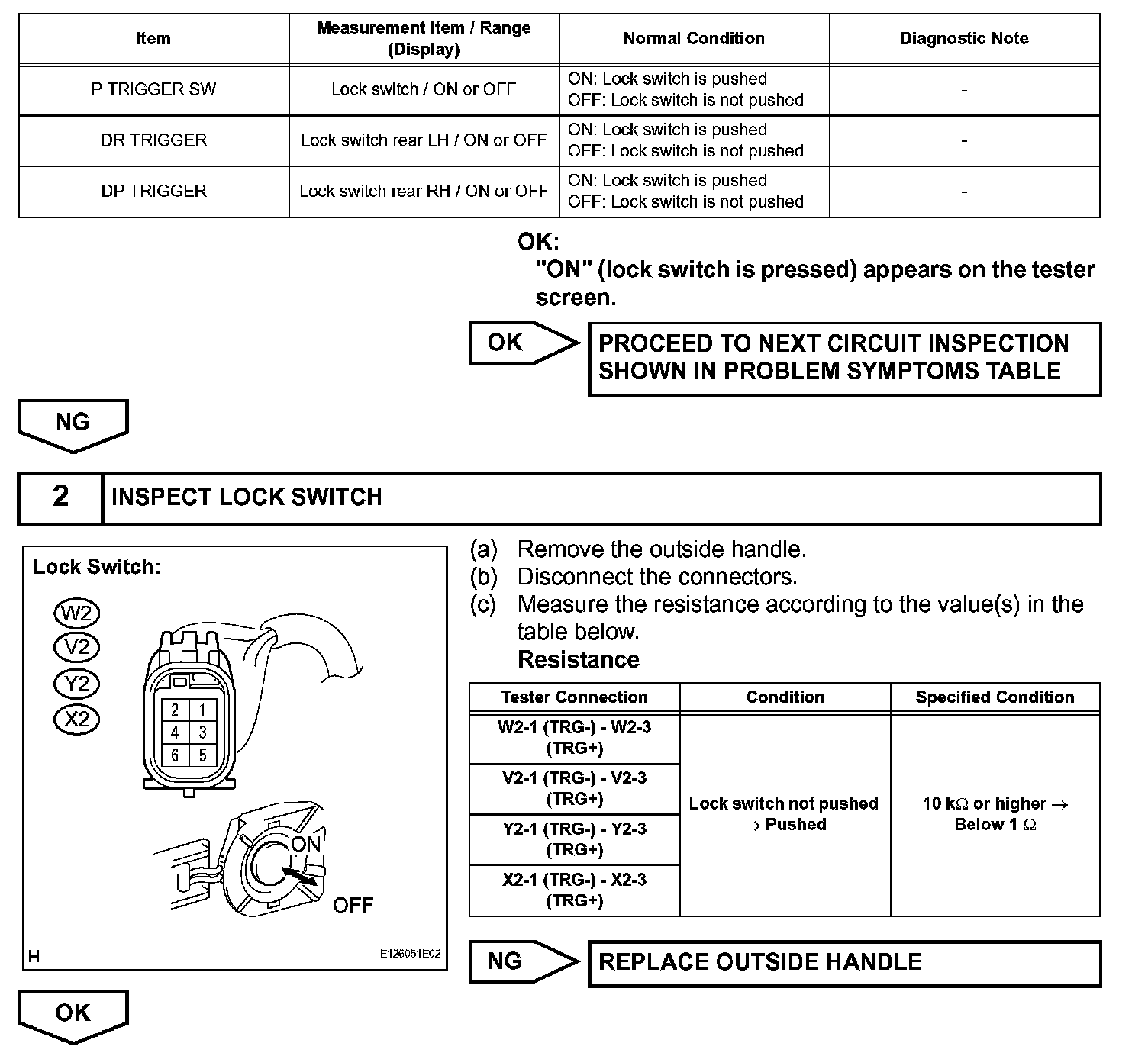 Lock switches (trigger switch) are built into the outside handles of each door. The certification ECU detects the conditions of the each lock switch.