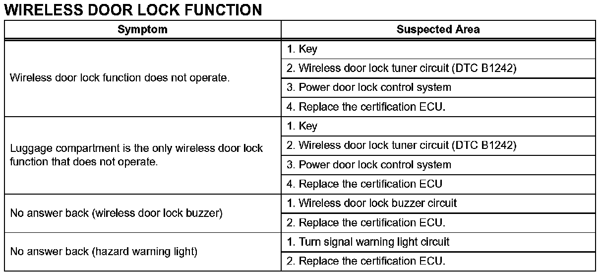 Problem Symptoms Table-Entry Lock/Unlock Function (Part 1):