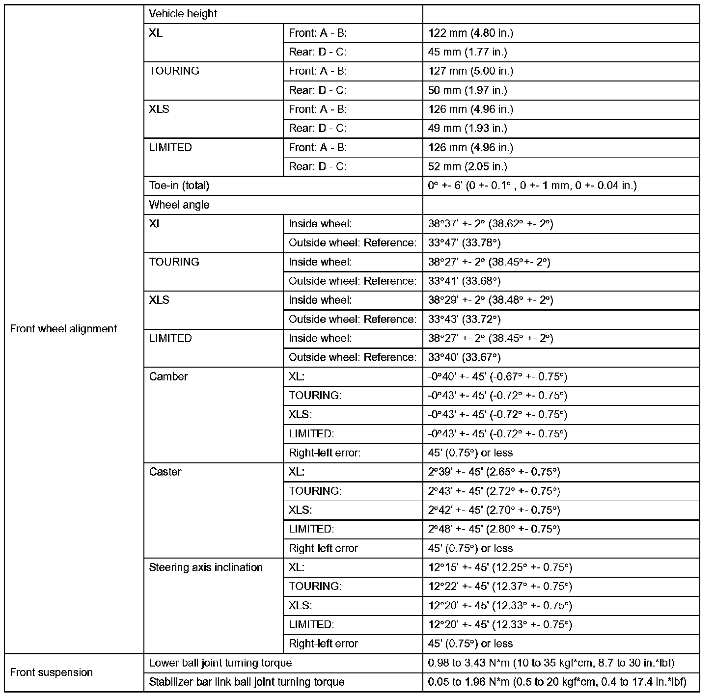 Front Suspension Service Data: