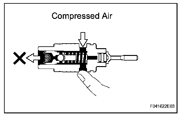 (b) Check the flow control valve for leakage. Close one of the holes and apply compressed air, 392 to 490 kPa (4 to 5 kgf/cm2, 57 to 71 psi), into the opposite side hole, and confirm that air does not come out from the end holes.