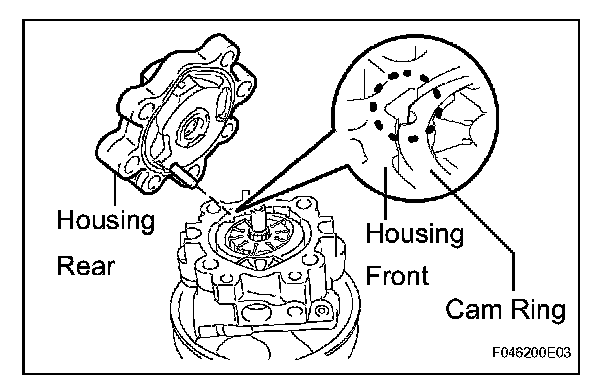 (b) Align the straight pin of the vane pump housing rear with the dents of the vane pump cam ring, vane pump side plate front and the vane pump housing front, and install the vane pump housing rear with the 4 bolts.