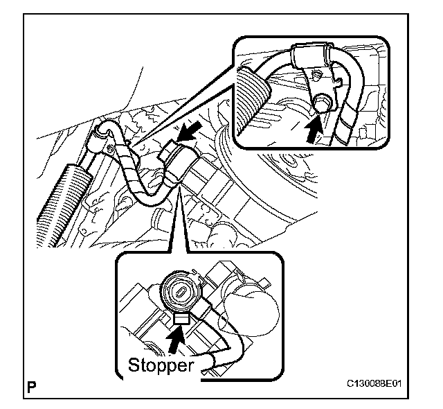 HINT: Make sure that the stopper of the pressure feed tube assembly contacts the vane pump assembly as shown in the illustration, then tighten the union bolt.
