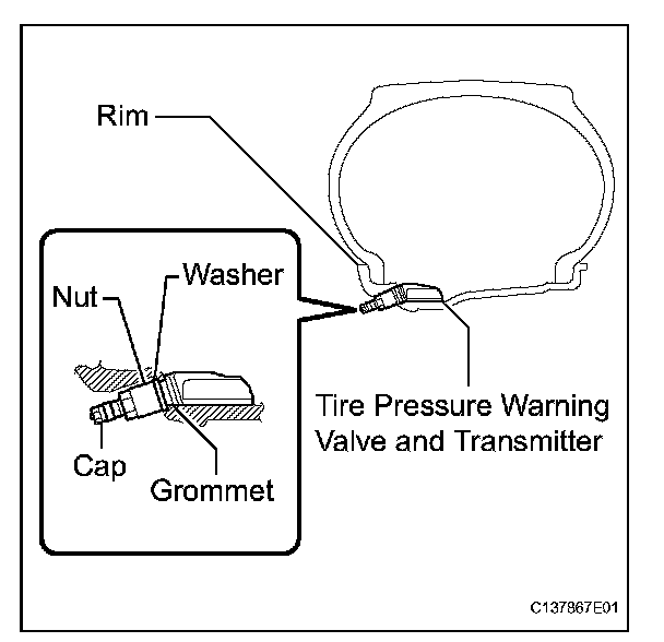 ^ Check that there is no oil, water, or lubricant around the rim hole, tire pressure warning valve and transmitter, washer, and nut. Failing to do so may result in improper installation.