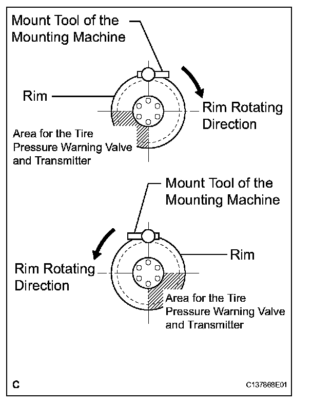 (c) Set the wheel disc to the mounting machine and install the lower tire bead. Position the main body of the tire pressure warning valve and transmitter in the shaded area shown in the illustration.