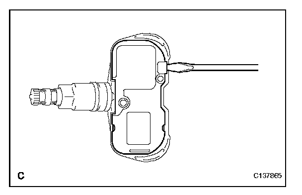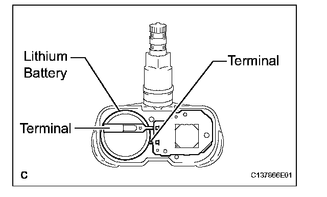 HINT: The tire pressure warning valve and transmitter is powered by a lithium battery. When disposing of the tire pressure warning valve and transmitter, remove the battery and dispose of it correctly.