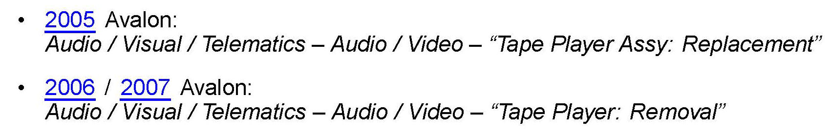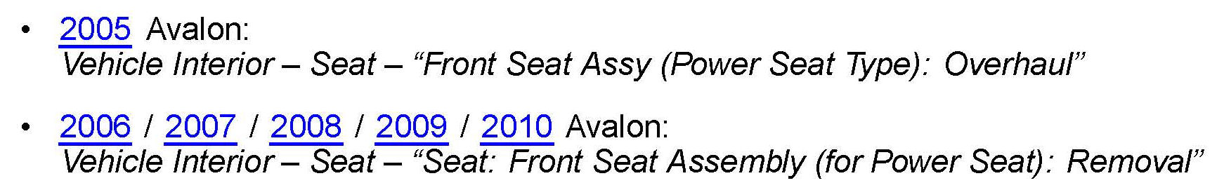 Refer to TIS applicable model year Avalon Repair Manual: