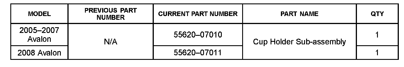 A cup holder sub-assembly is now available for 2005 - 2008 model year Avalon vehicles. This new service part eliminates the need to replace the center console sub-assembly when only the cup holder requires replacement. The following replacement procedure should be used when replacing the cup holder sub-assembly.