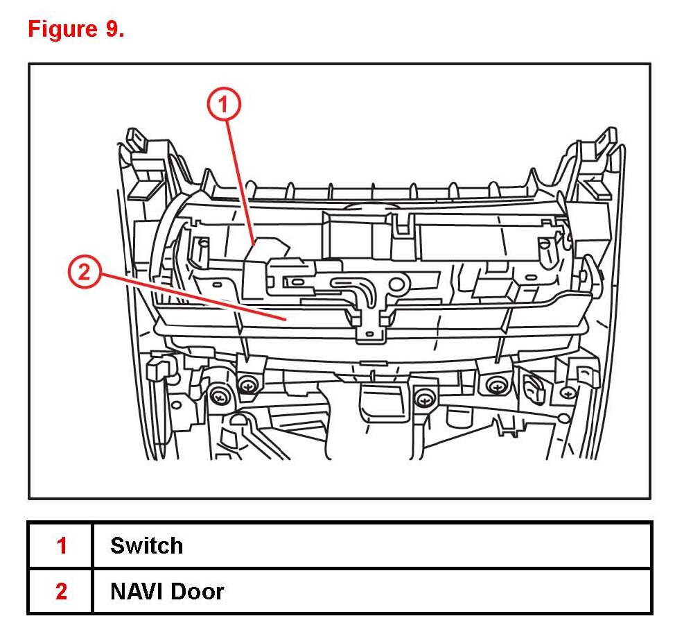 4. Insert a pick between the switch and the black plastic door side piece of the door sub-assembly.