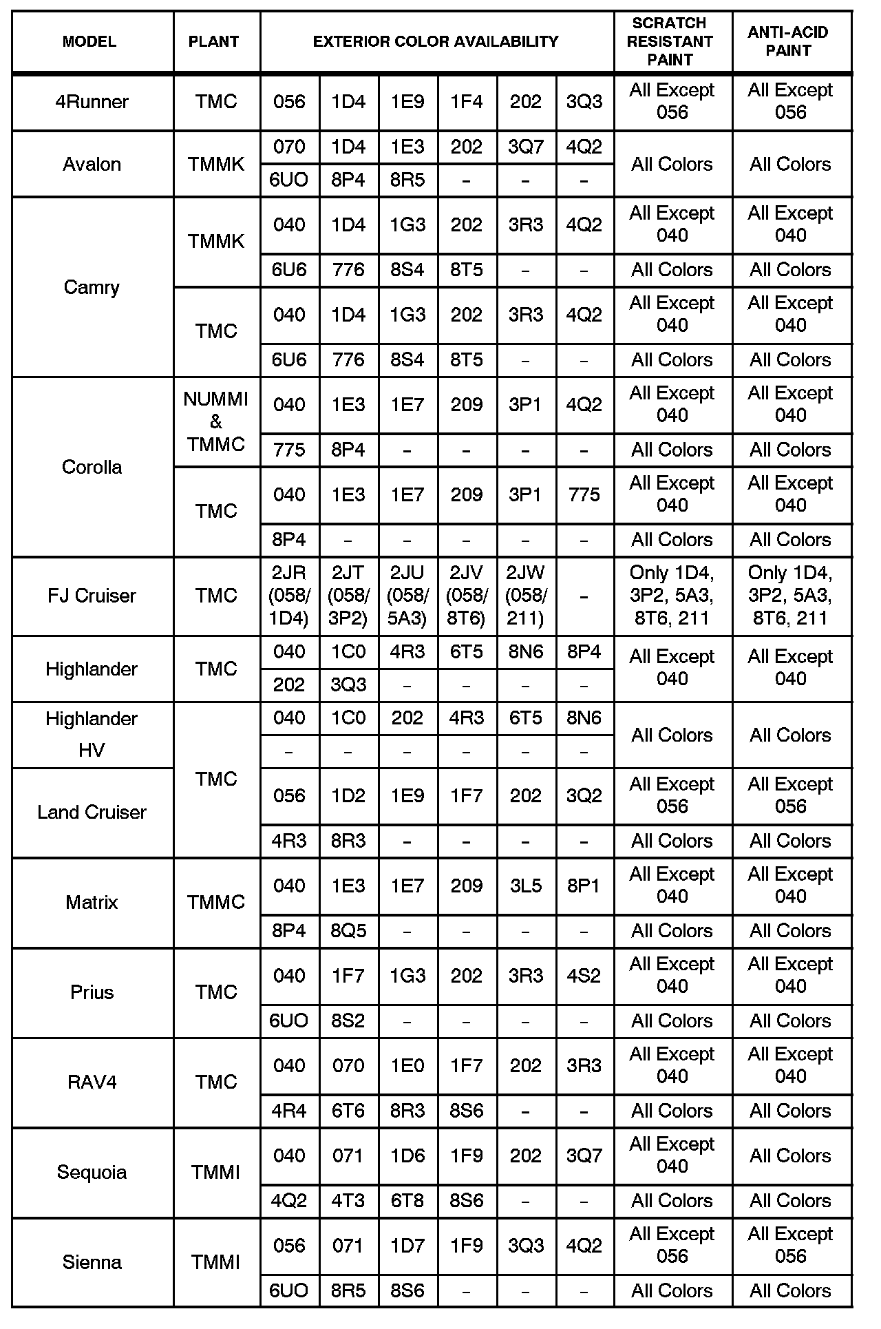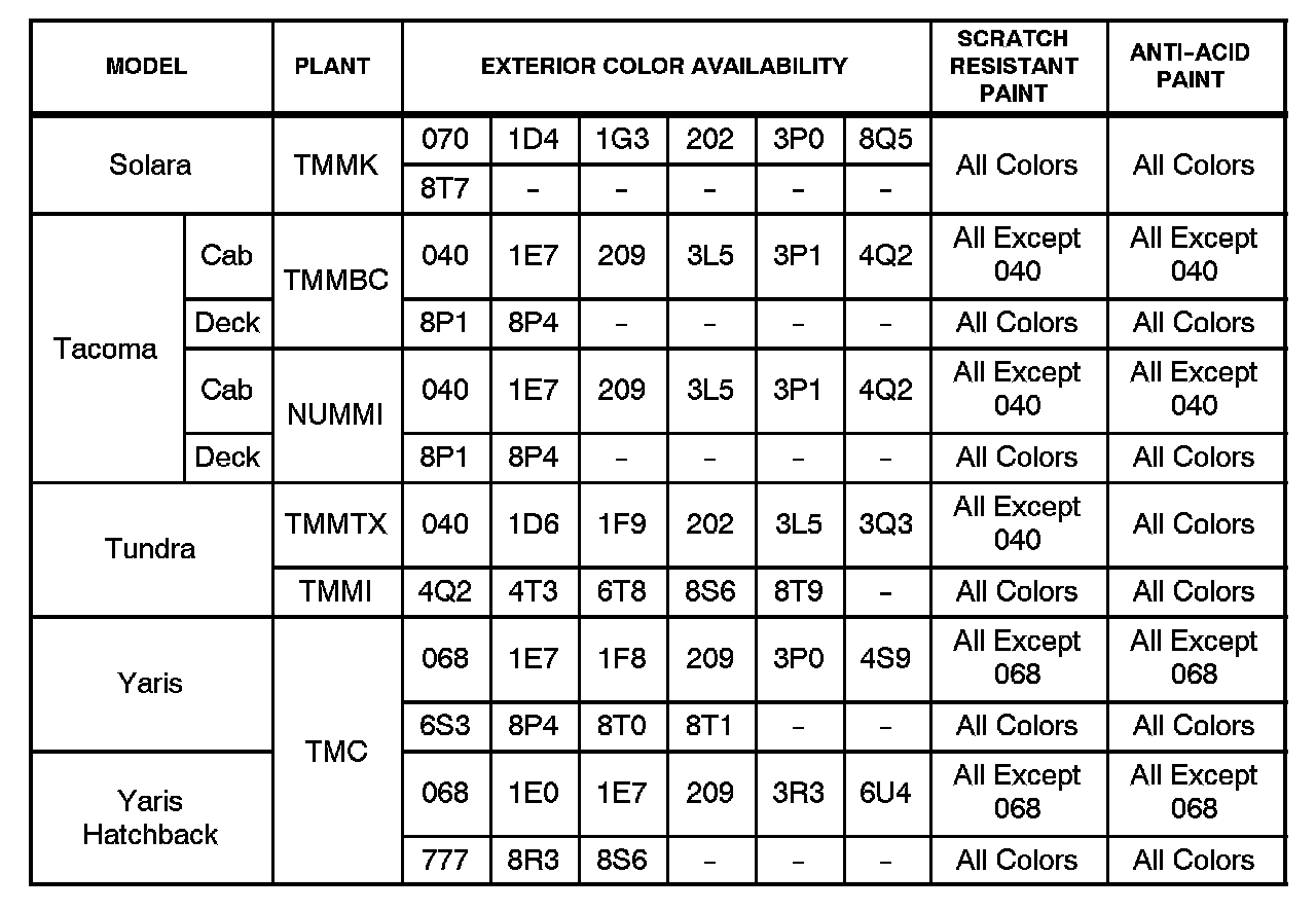 Most colors on Toyota vehicles sold in the U.S. use a combination of scratch resistant and/or acid rain resistant exterior (body color) paint finishes. These types of finishes provide improved resistance to minor scratching and acid rain.