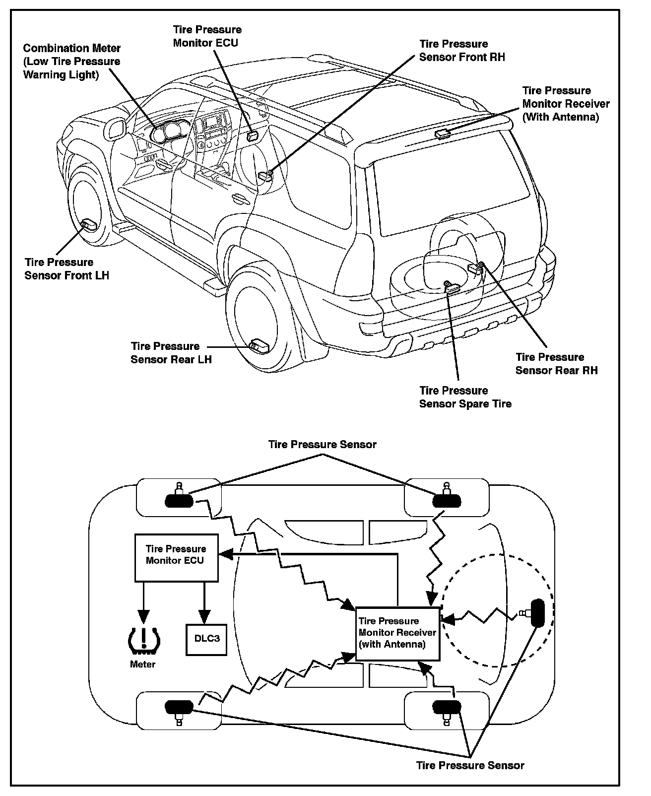 ^ The antenna/receiver receives each tire pressure, tire temperature, and the unique tire pressure warning valve/sensor ID numbers through radio wave signals from the tire pressure warning valve/sensors and then transmits the information to the TPWS ECU.