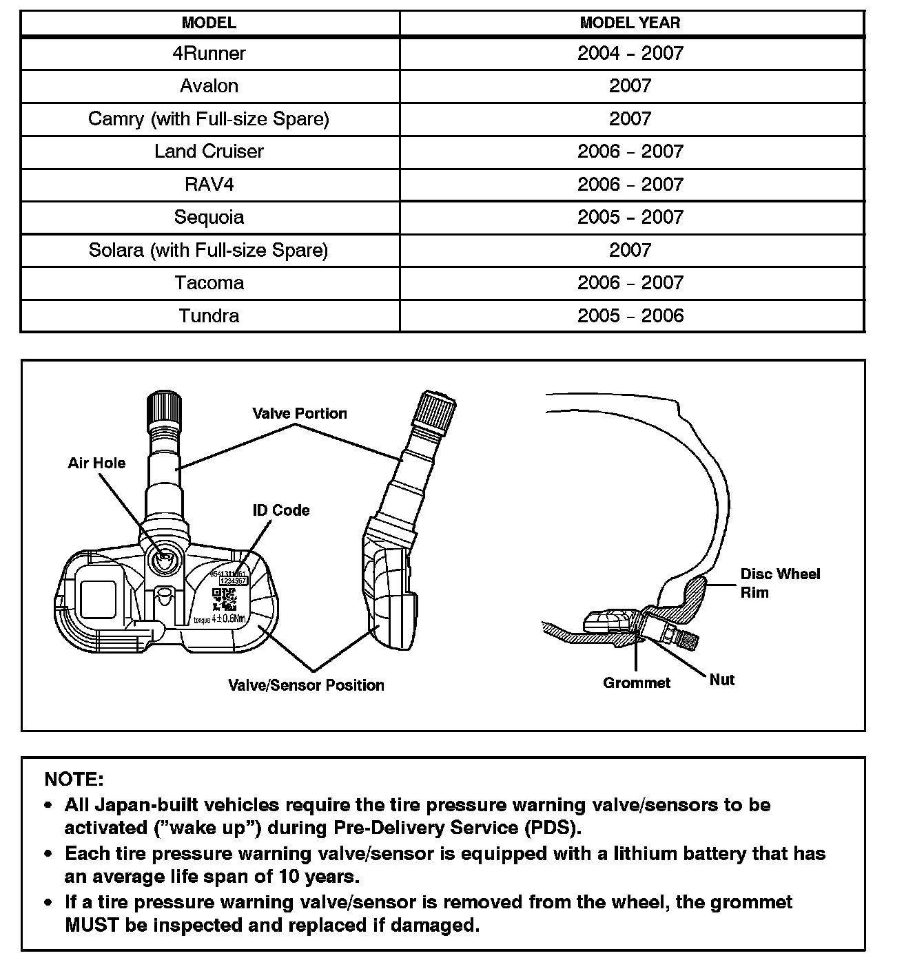 ^ Vehicles equipped with a tire pressure warning valve/sensor inside the spare tire are listed in the table shown.