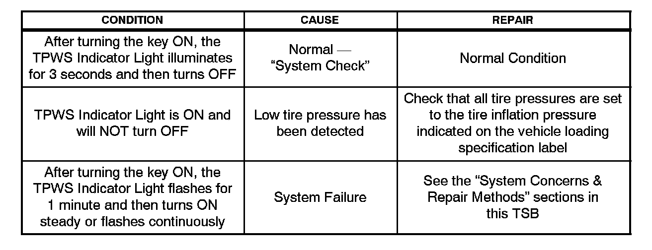 Conditions for the Tire Pressure Warning System Indicator Light "ON" or "Flashing" are listed in the table shown.