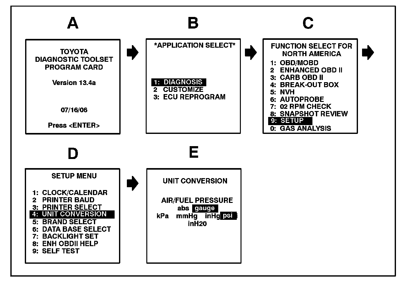 When diagnosing the TPWS with the Diagnostic Tester, it must be set up to read the tire pressures in "psi - gauge" (psi - g). Follow the screens below from the Diagnostic Tester to convert the tire pressures to psi - g.