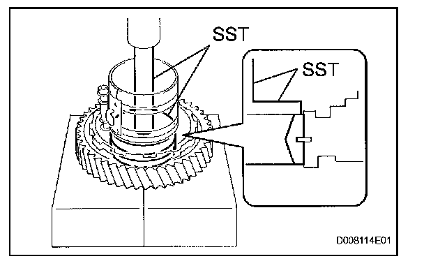 (c) Using SST and a press, press in the outer race of the radial ball bearing rear.