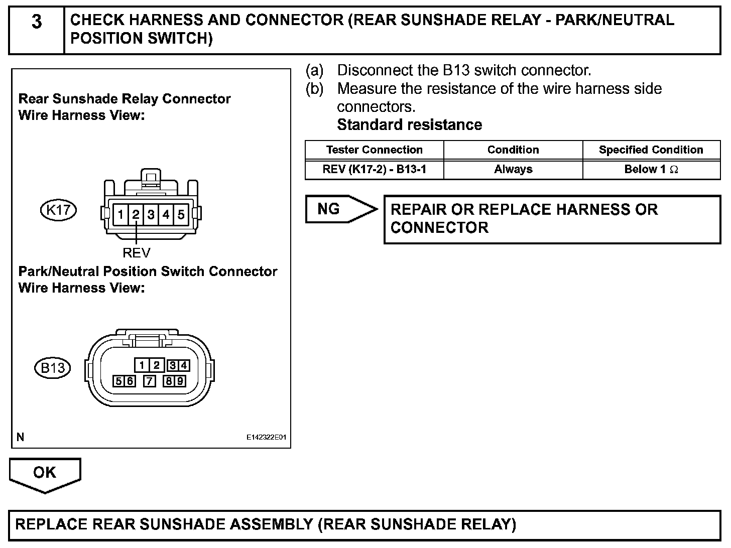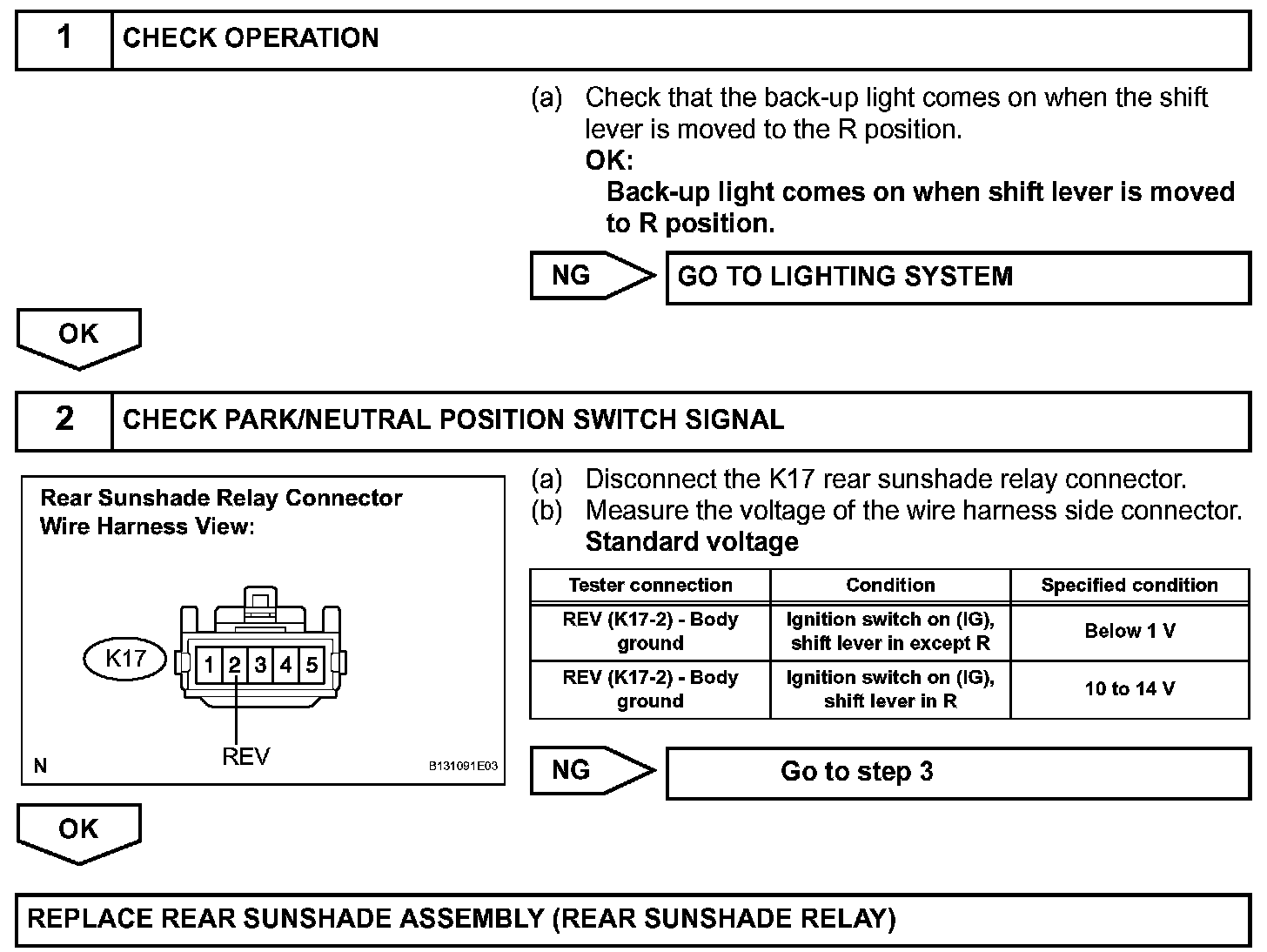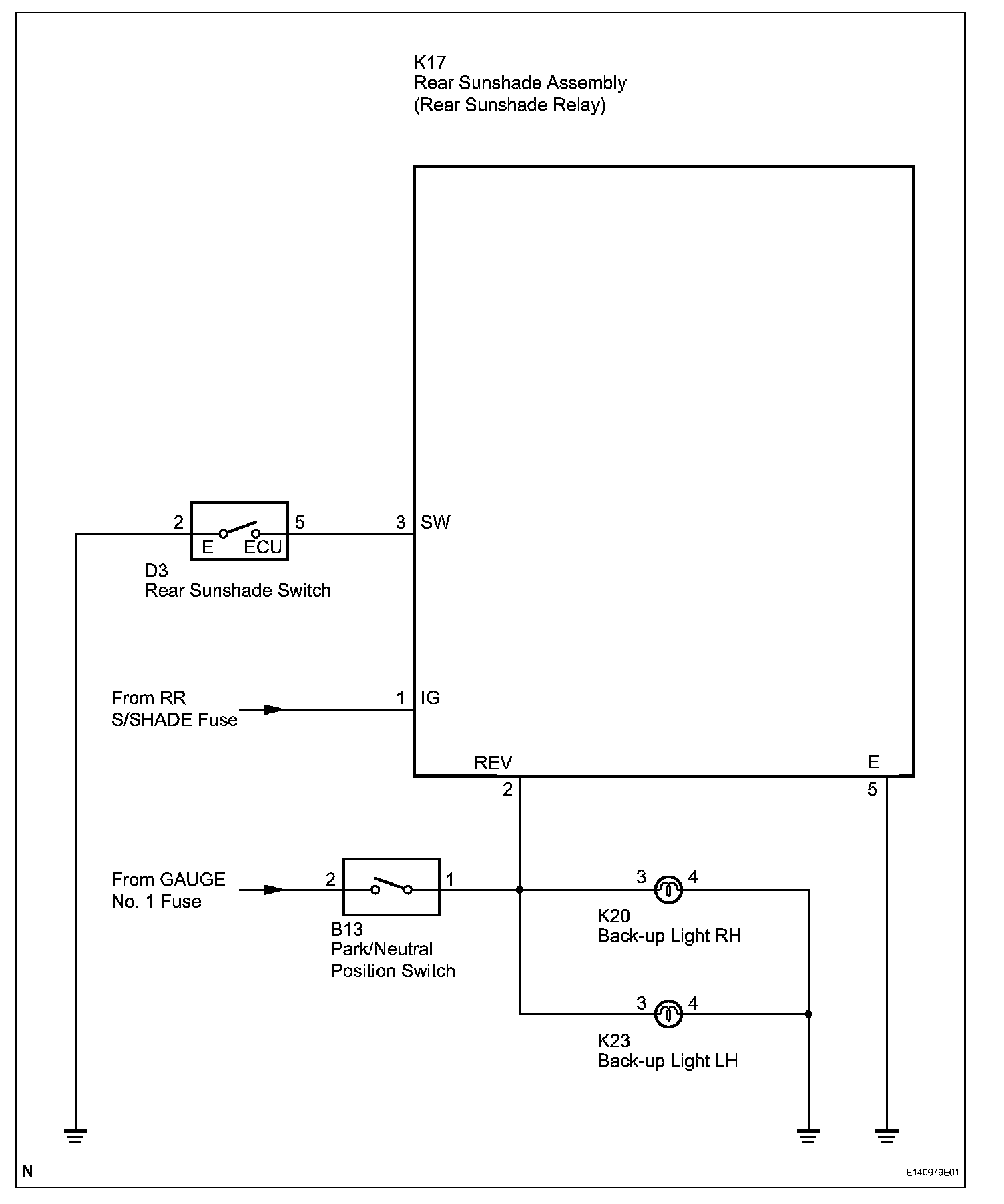 When the ignition switch is on (IG) and the rear sunshade is raised, moving the shift lever to R causes the park/neutral position switch to send a reverse-linked signal to the rear sunshade relay. The relay then lowers the rear sunshade.