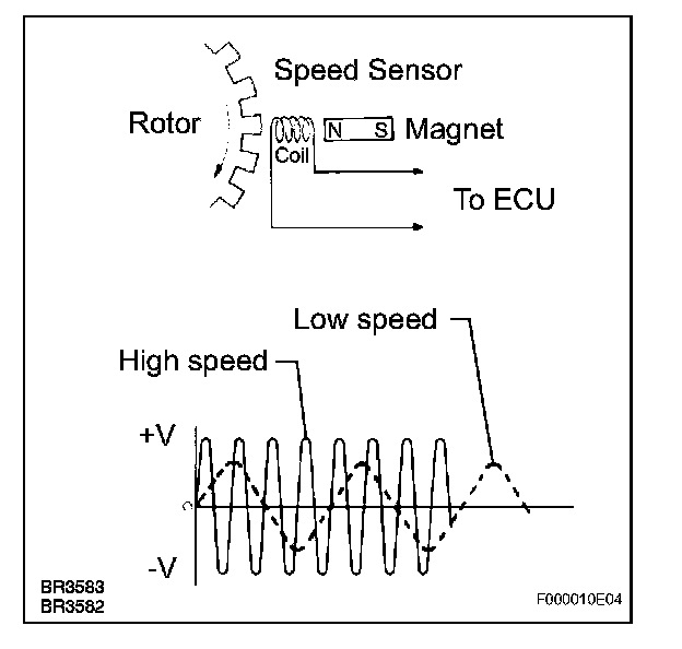 Since the frequency of this AC voltage changes in direct proportion to the speed of the rotor, the frequency is used by the ECU to detect the speed of each wheel.