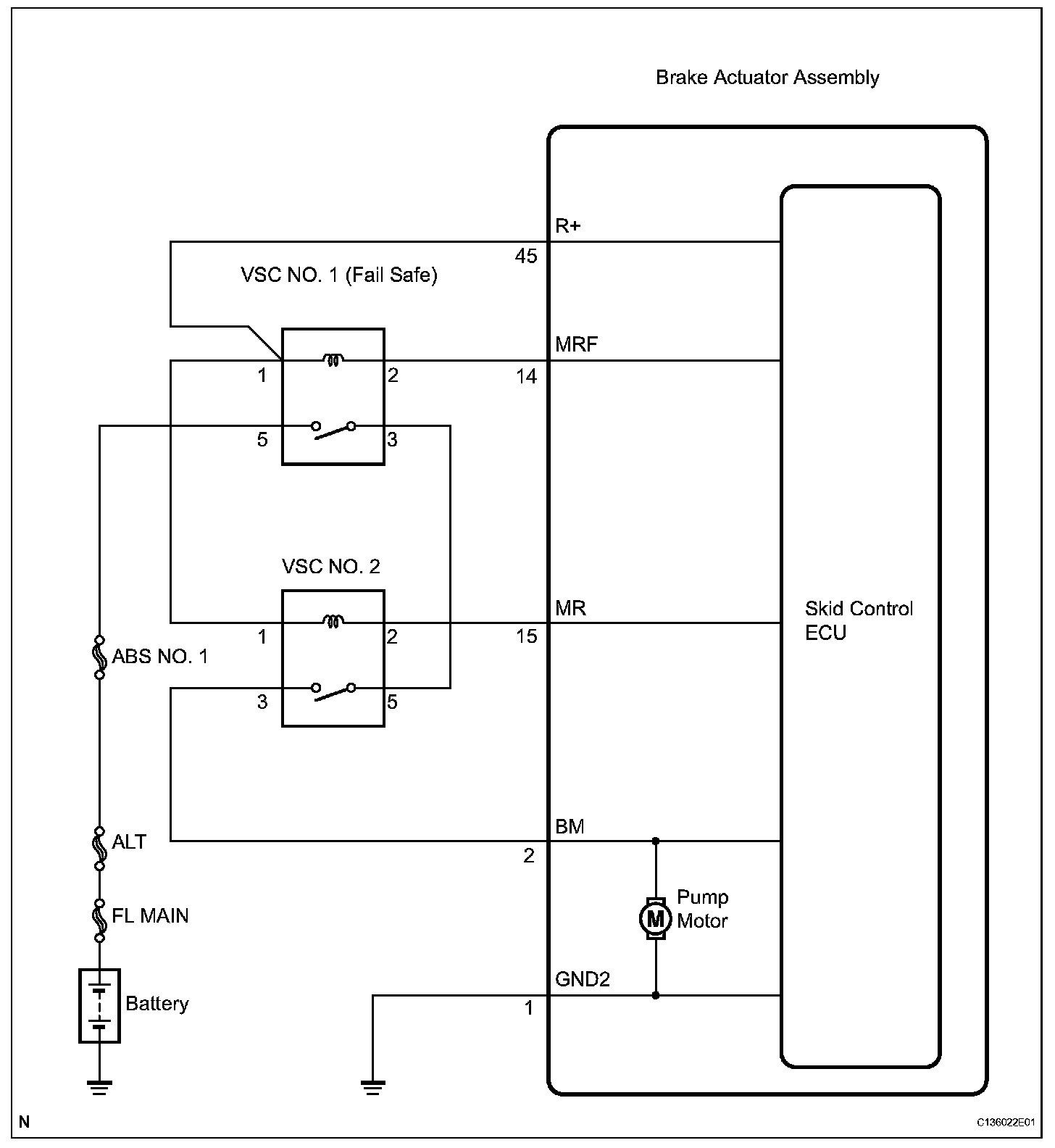 While any of the ABS, TRAC, VSC, or BA is operating, the skid control ECU (housed in the actuator assembly) turns the VSC NO. 2 relay on and activates the pump motor in the brake actuator.