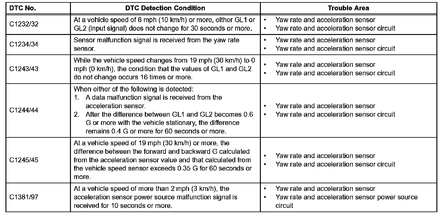 DTCs C0371/71 and C1279/79 can be deleted when the yaw rate and acceleration sensor sends a yaw rate and/or acceleration signal or the Test Mode ends. DTCs C0371/71 and C1279/79 are output only in the Test Mode.