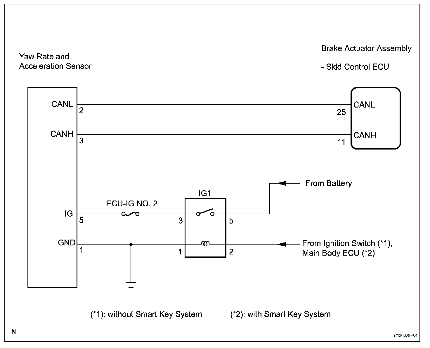 The skid control ECU receives signals from the yaw rate and acceleration sensor via the CAN communication system.