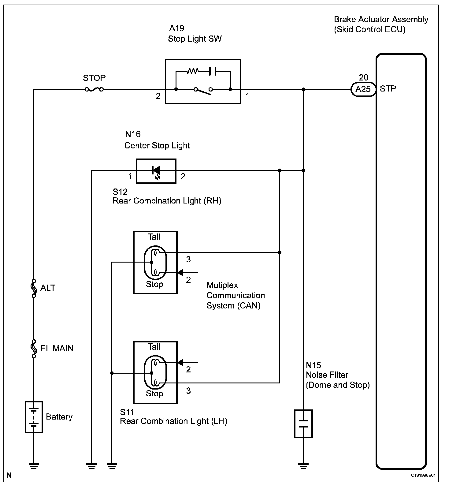 This circuit recognizes brake operation by sending a stop light signal to the skid control ECU.