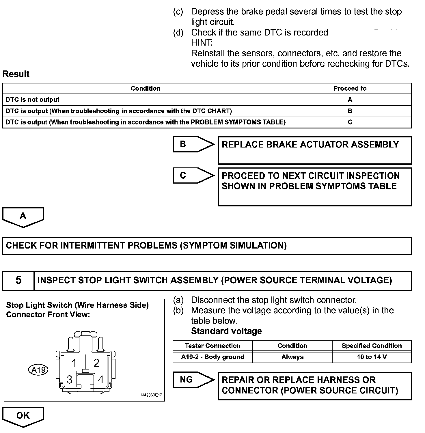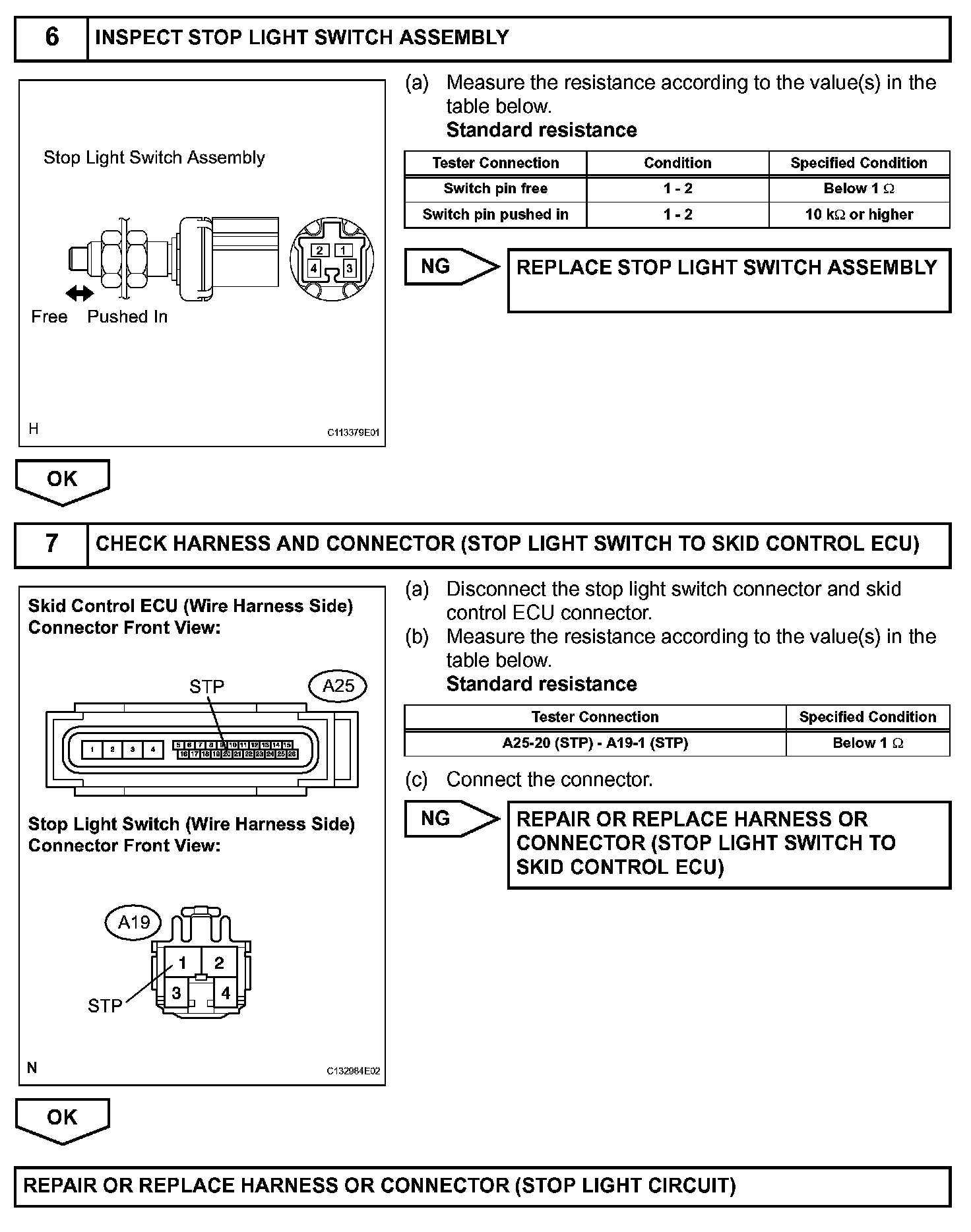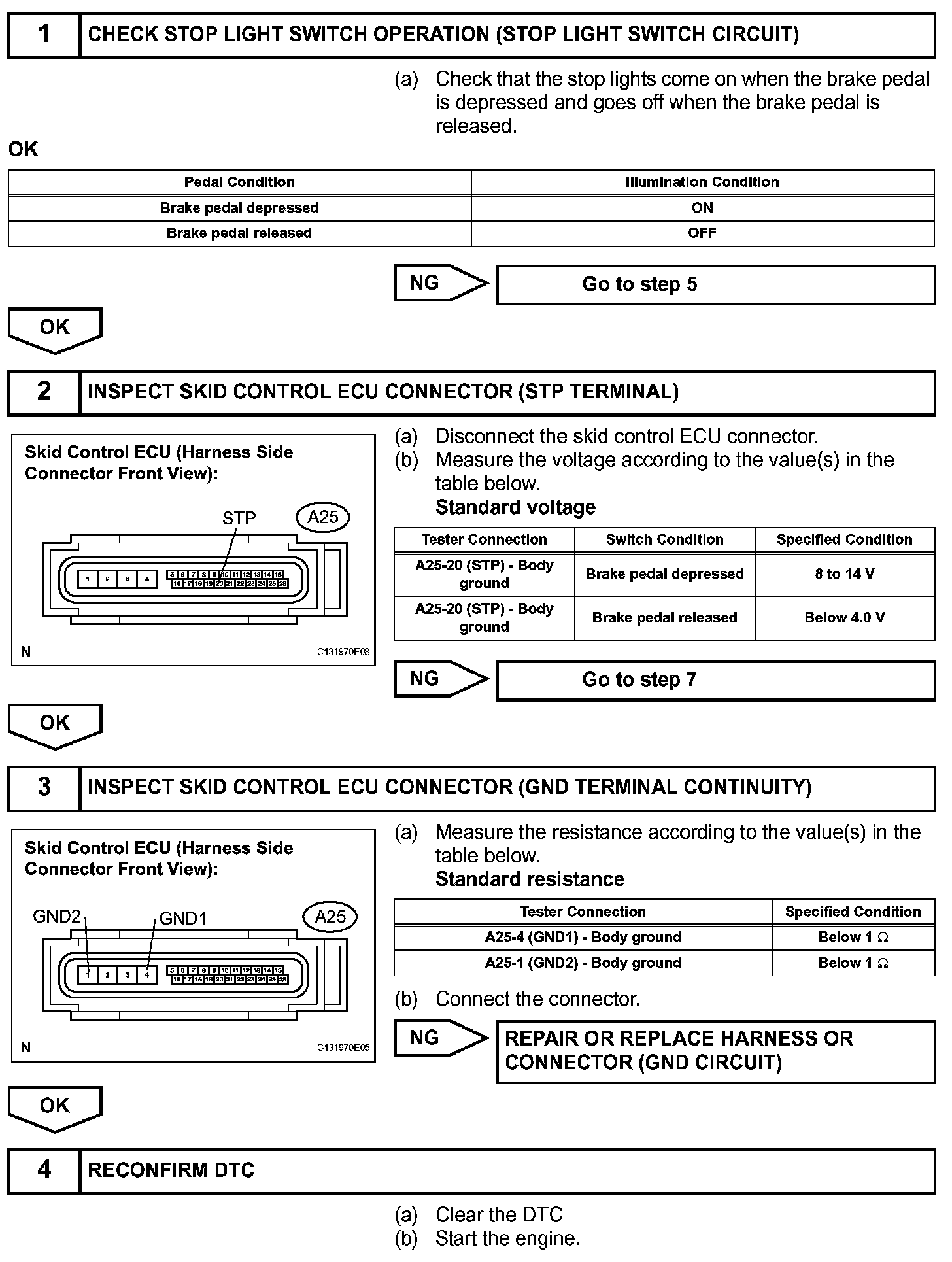 The skid control ECU has an open detection circuit, which outputs this DTC when detecting an open in the stop light signal input line (STP terminal) or the ground line of the stop light circuit with the stop light switch off (brake pedal not depressed).