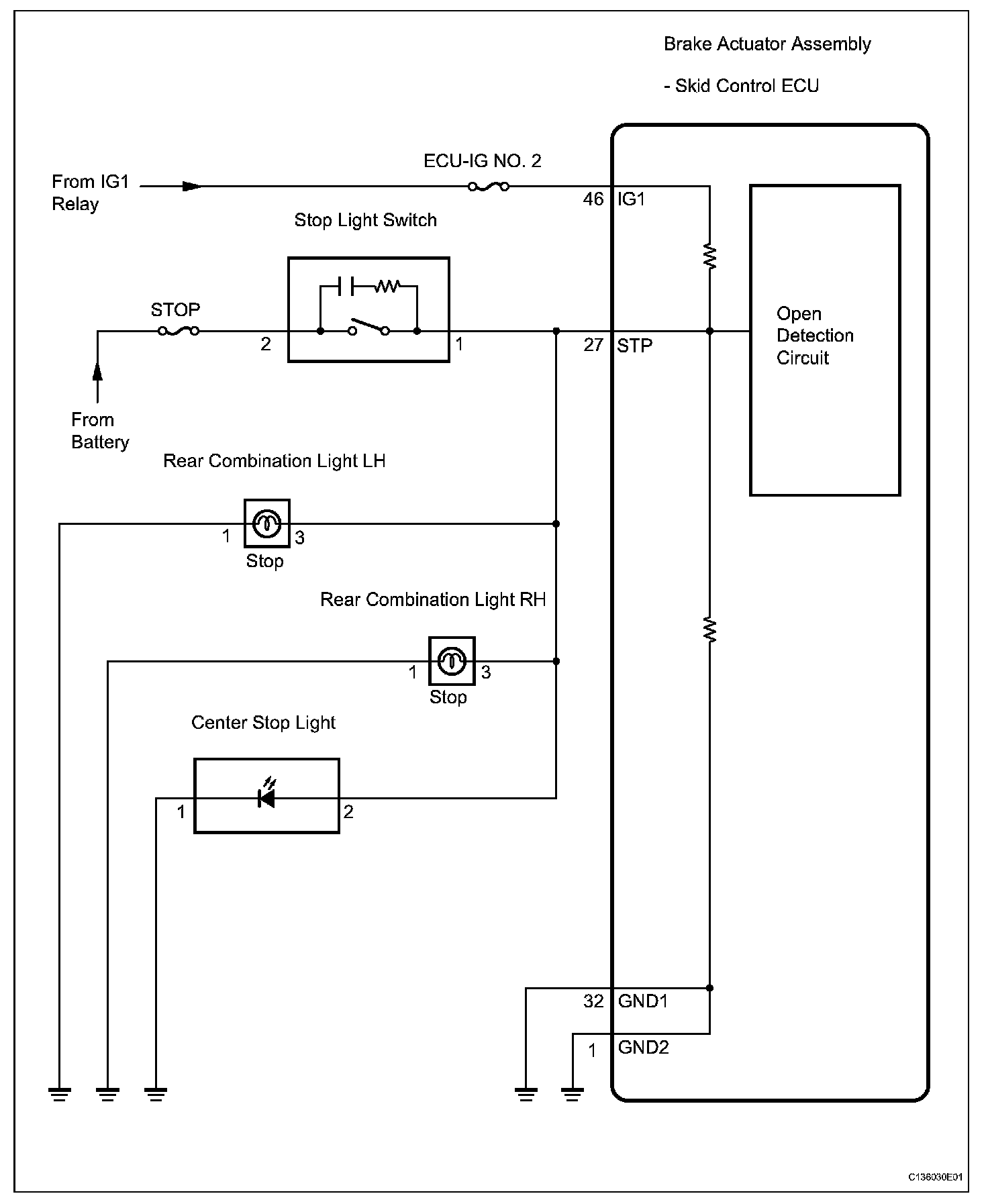 The skid control ECU has an open detection circuit, which outputs this DTC when detecting an open in the stop light input line while the stop light switch is OFF.