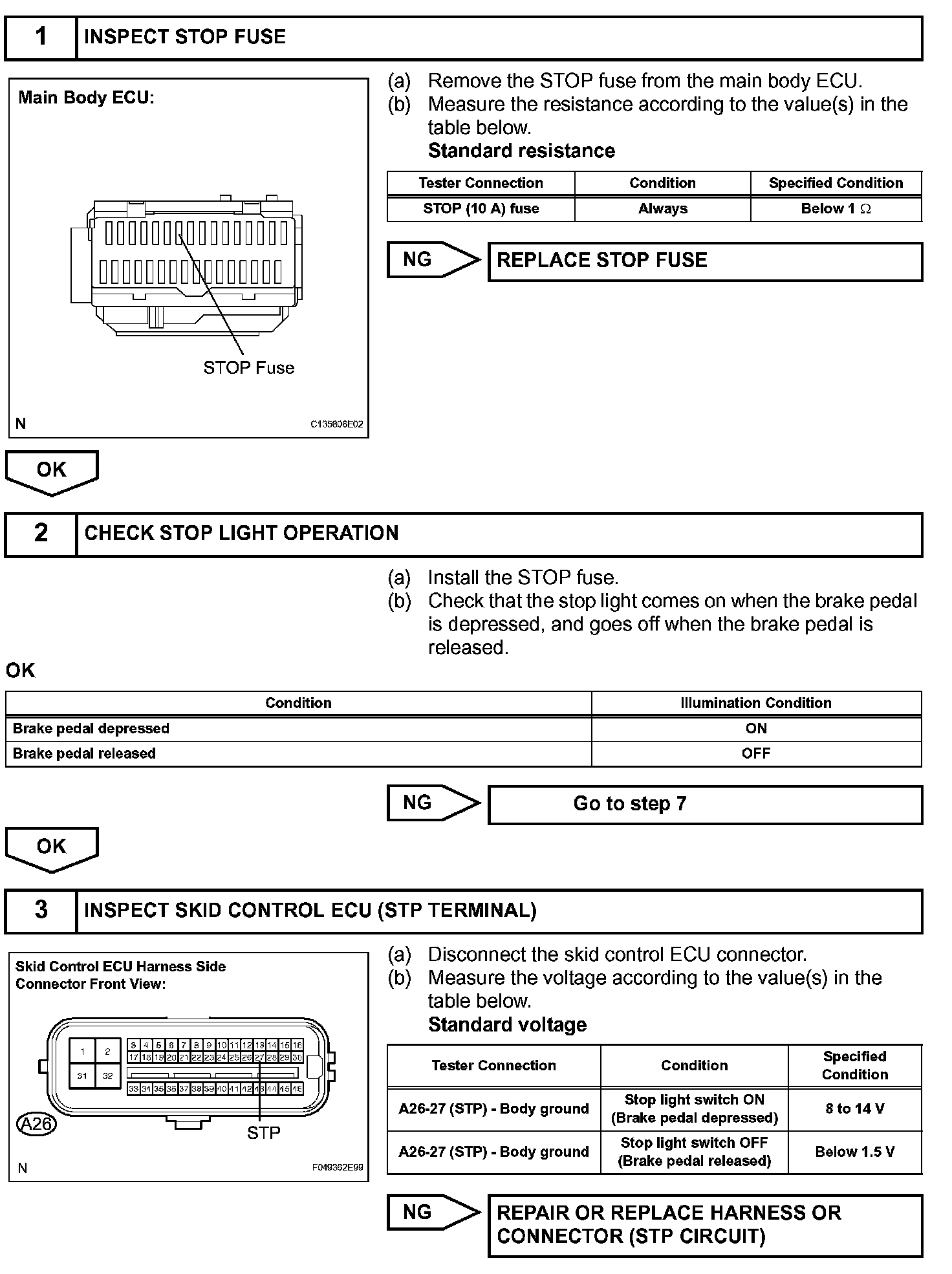 The skid control ECU (housed in the actuator assembly) inputs the stop light switch signal and the condition of brake operation.