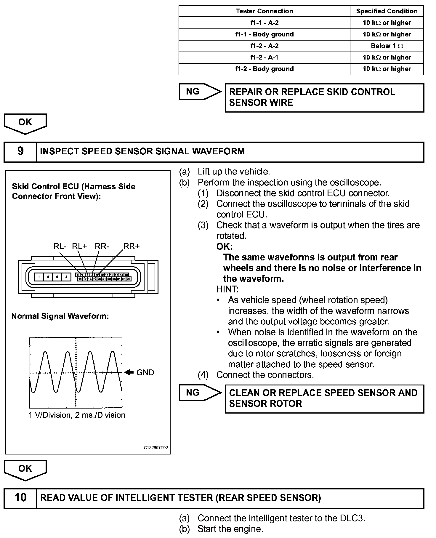 When the rotors rotate, the magnetic field generated by the permanent magnet in the speed sensor induces AC voltage. Since the frequency of this AC voltage changes in direct proportion to the speed of the rotor, the frequency is used by the ECU to detect the speed of each wheel.