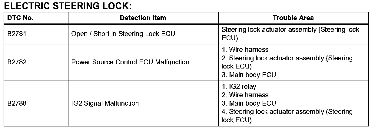 HINT: The steering lock ECU does not store DTCs regarding the past problems.