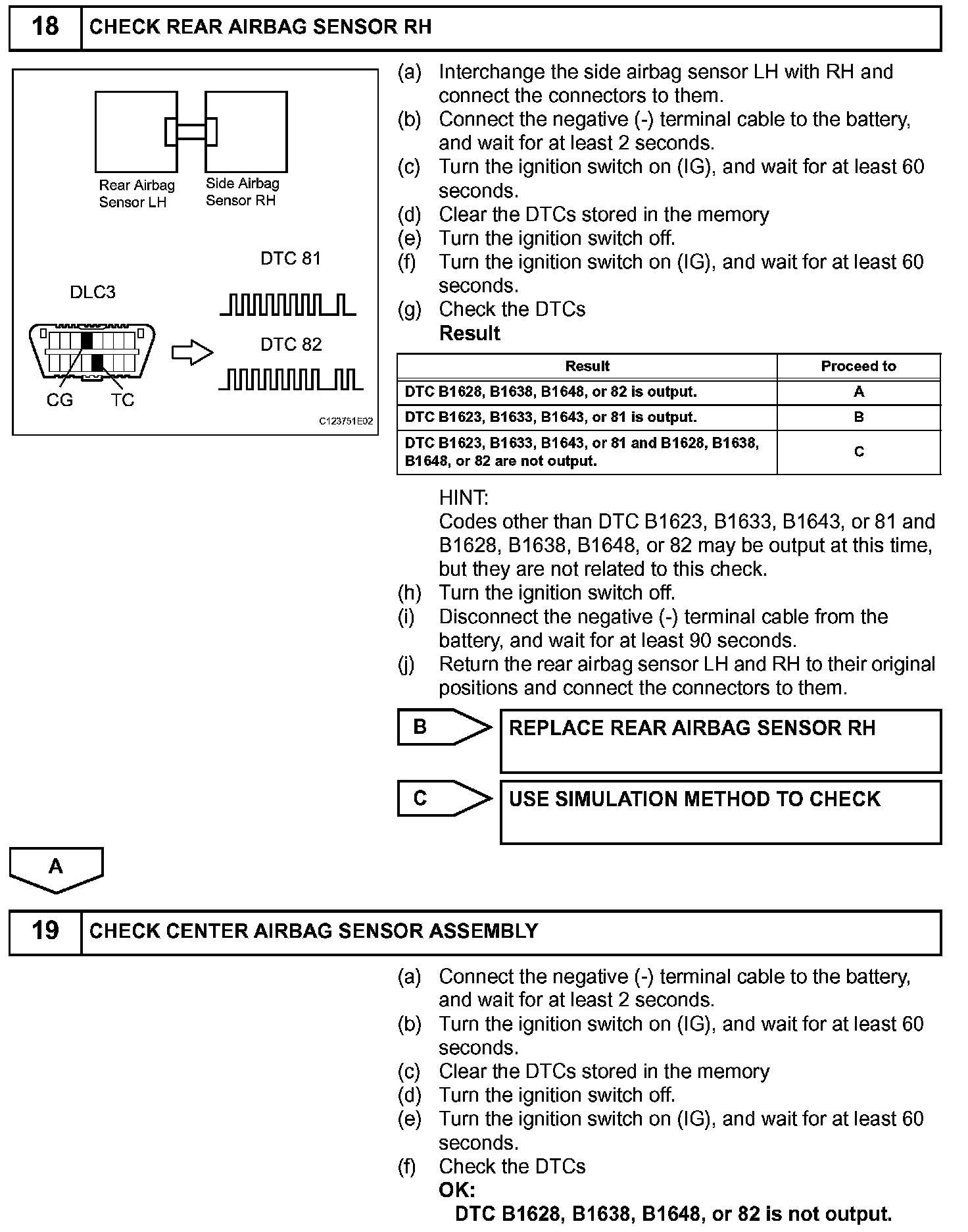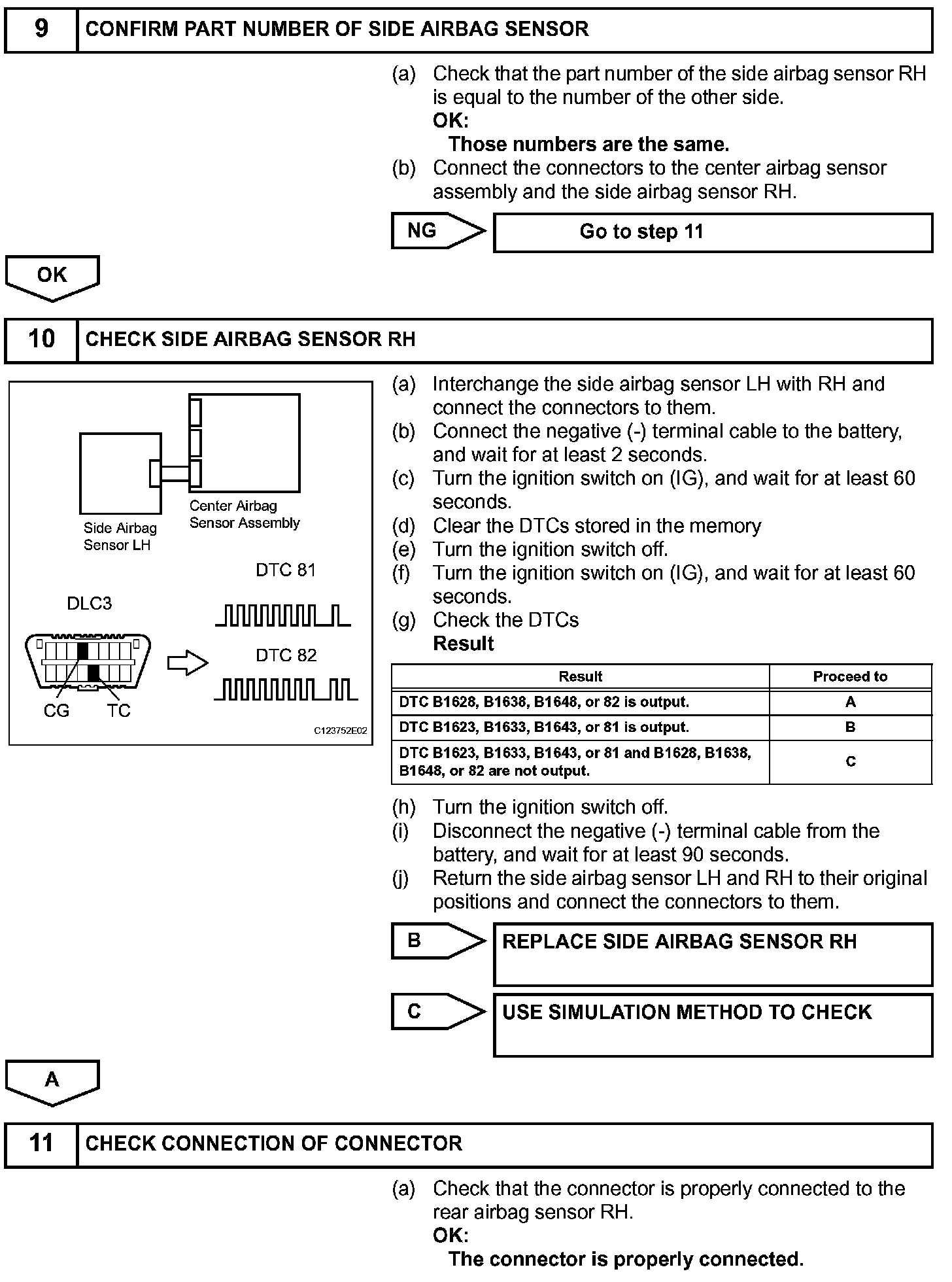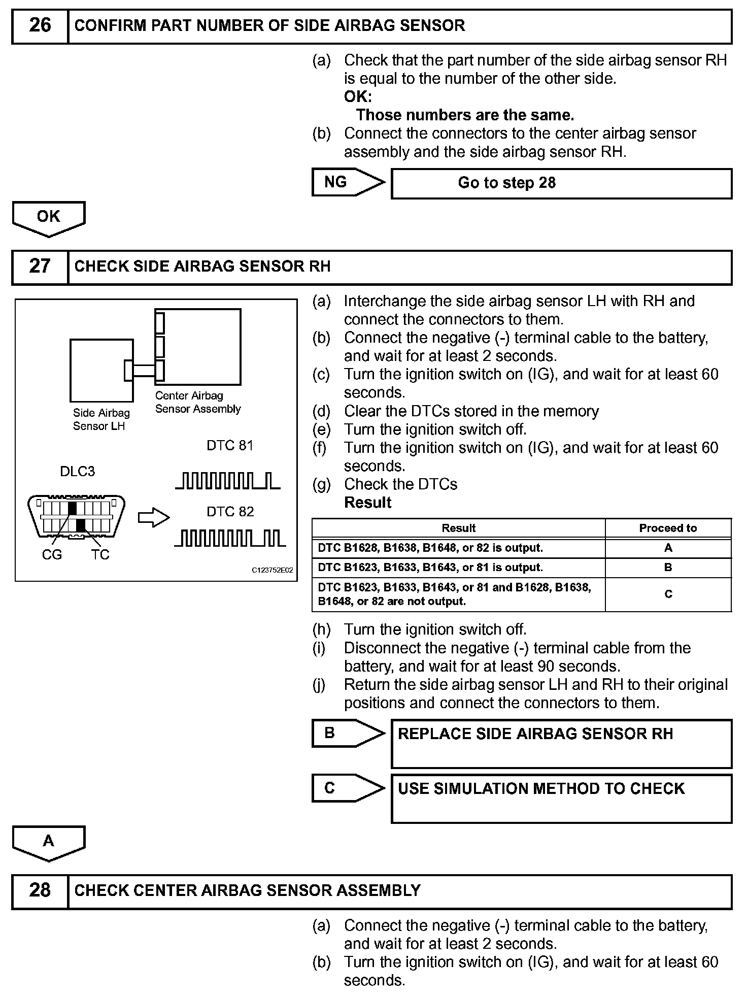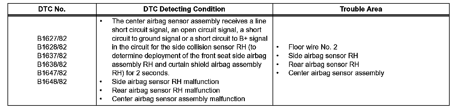 DTC B1627/82, B1628/82, B1637/82, B1638/82, B1647/82, or B1648/82 is recorded when a malfunction is detected in the circuit for the side collision sensor RH.