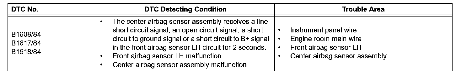 DTC B1608/84, B1617/84, or B1618/84 is recorded when a malfunction is detected in the front airbag sensor RH circuit.