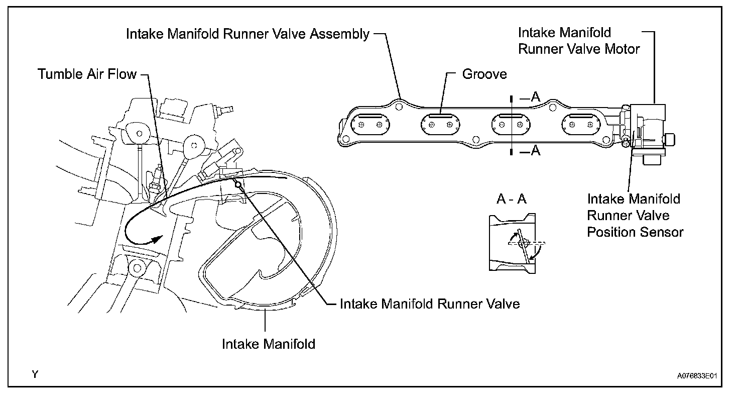 When the IMRV is closed, air flows through a groove into the cylinder from the intake manifold, so that a dynamic air flow or "tumble" air flow is generated in the cylinder. The tumble air flow drastically reduces fuel deposits inside the intake air port and the combustion wall surface inside the cylinder. This improves the combustion efficiency by boosting the air-fuel mixture and air flow turbulence.