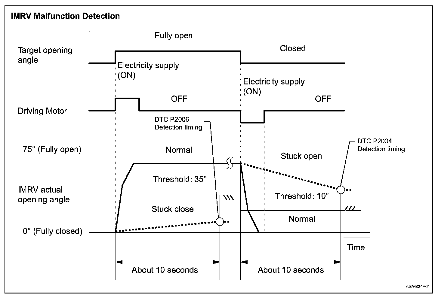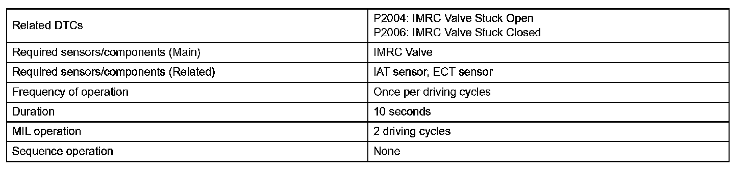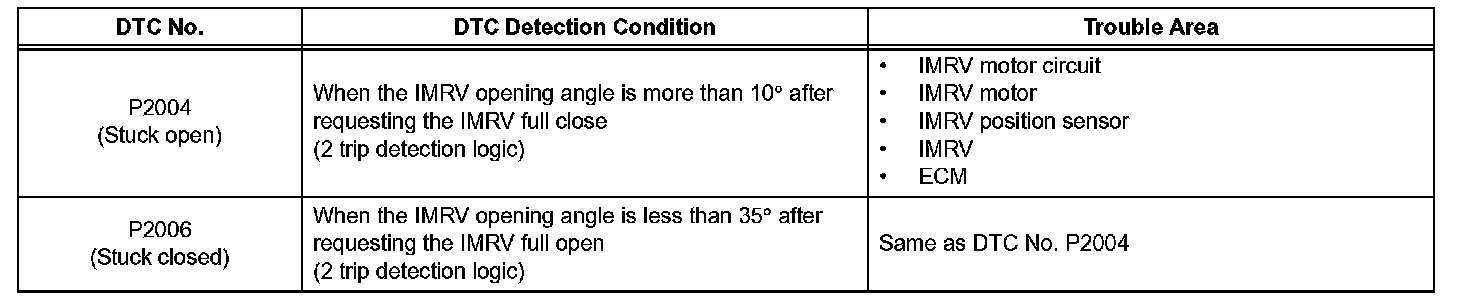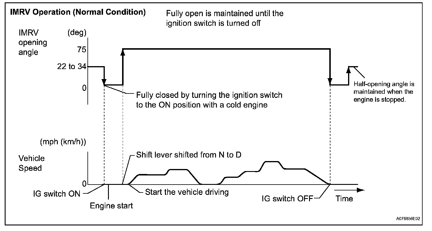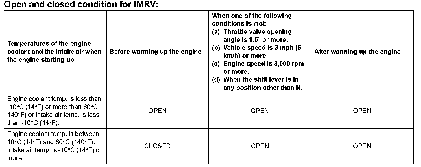 The ECM fully closes the IMRV during the first idle with the engine coolant temperature more than -10°C (14°F) and less than 60°C (140°F) and the intake air temperature is more than -10°C (14°F) before the engine is warmed up. In other condition, the ECM fully opens the IMRV.