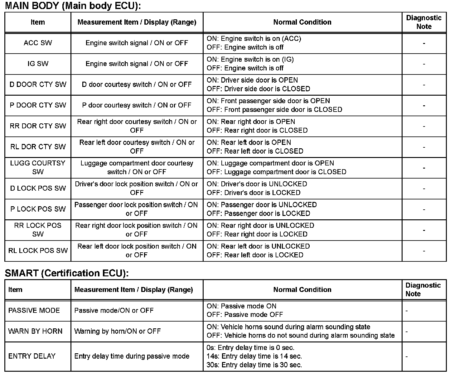 DATA LISTHINT: Using the intelligent tester DATA LIST allows switch, sensor, actuator and other item values to be read without removing any parts. Reading the DATA LIST early in troubleshooting is one way to shorten labor time.