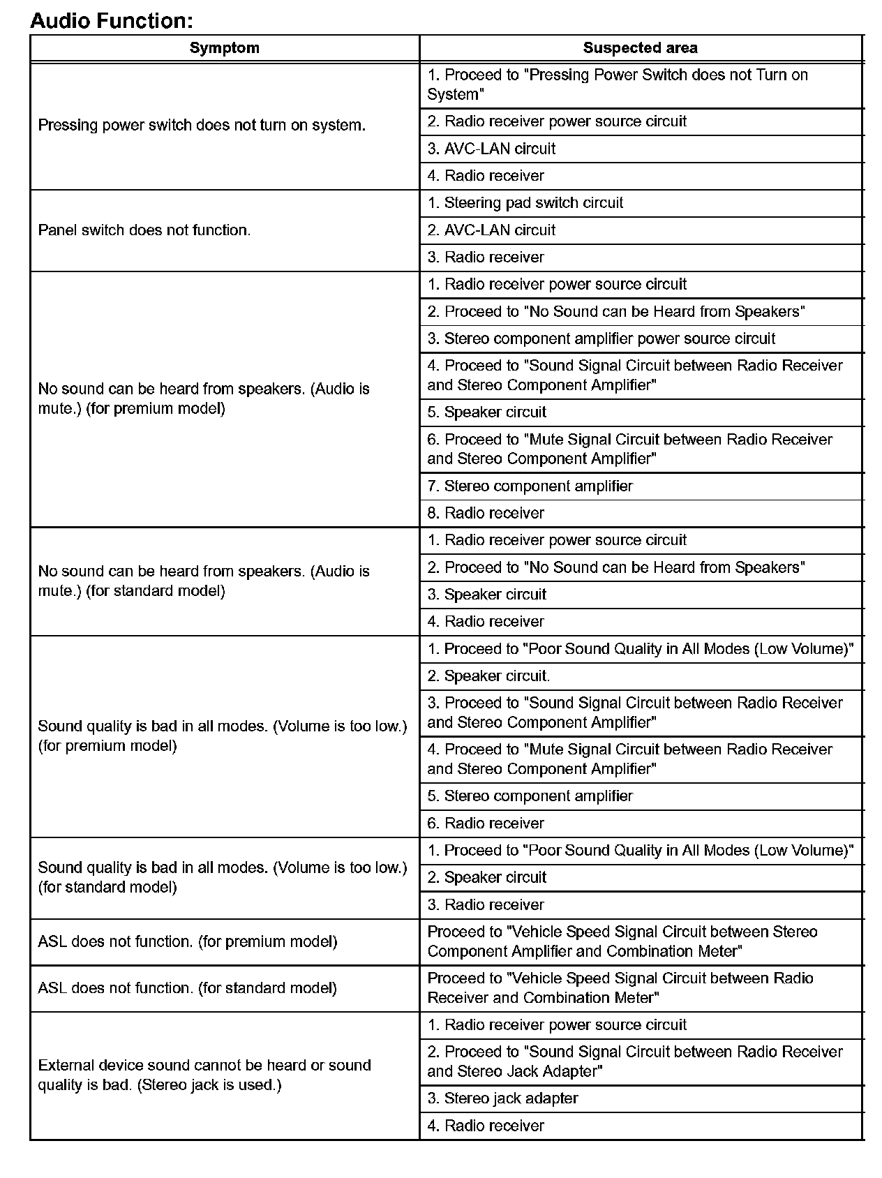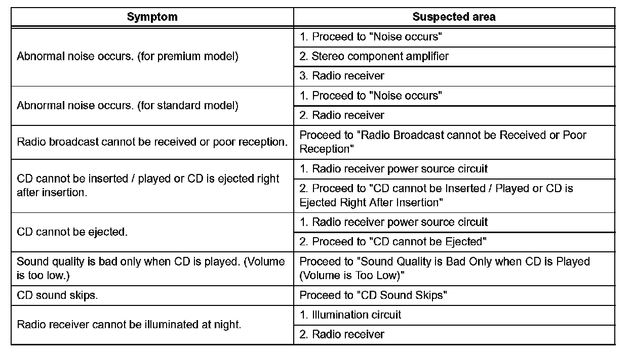 PROBLEM SYMPTOMS TABLEProblem Symptoms Table - Audio Function (Part 1):