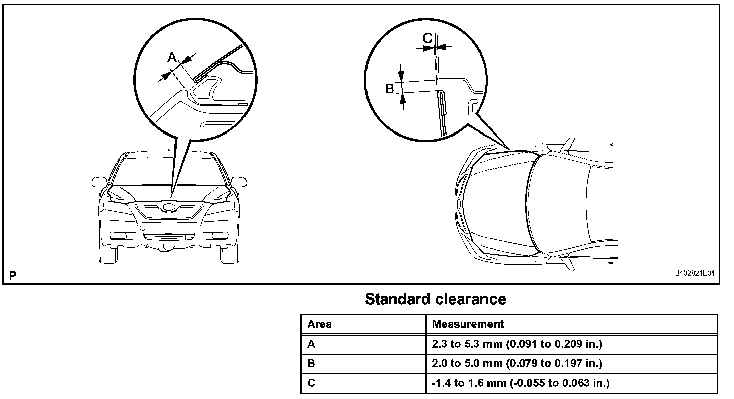 Check that the clearance measurements of areas A through C are within each standard range.