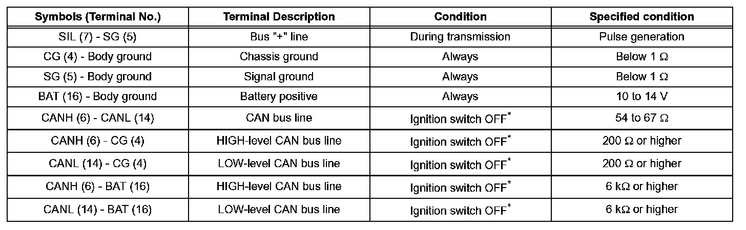 NOTE: *: Before measuring the resistance, leave the vehicle as is for at least 1 minute and do not operate the ignition switch, any other switches or the doors. If the result is not as specified, the DLC3 may have a malfunction. Repair or replace the harness and connector.