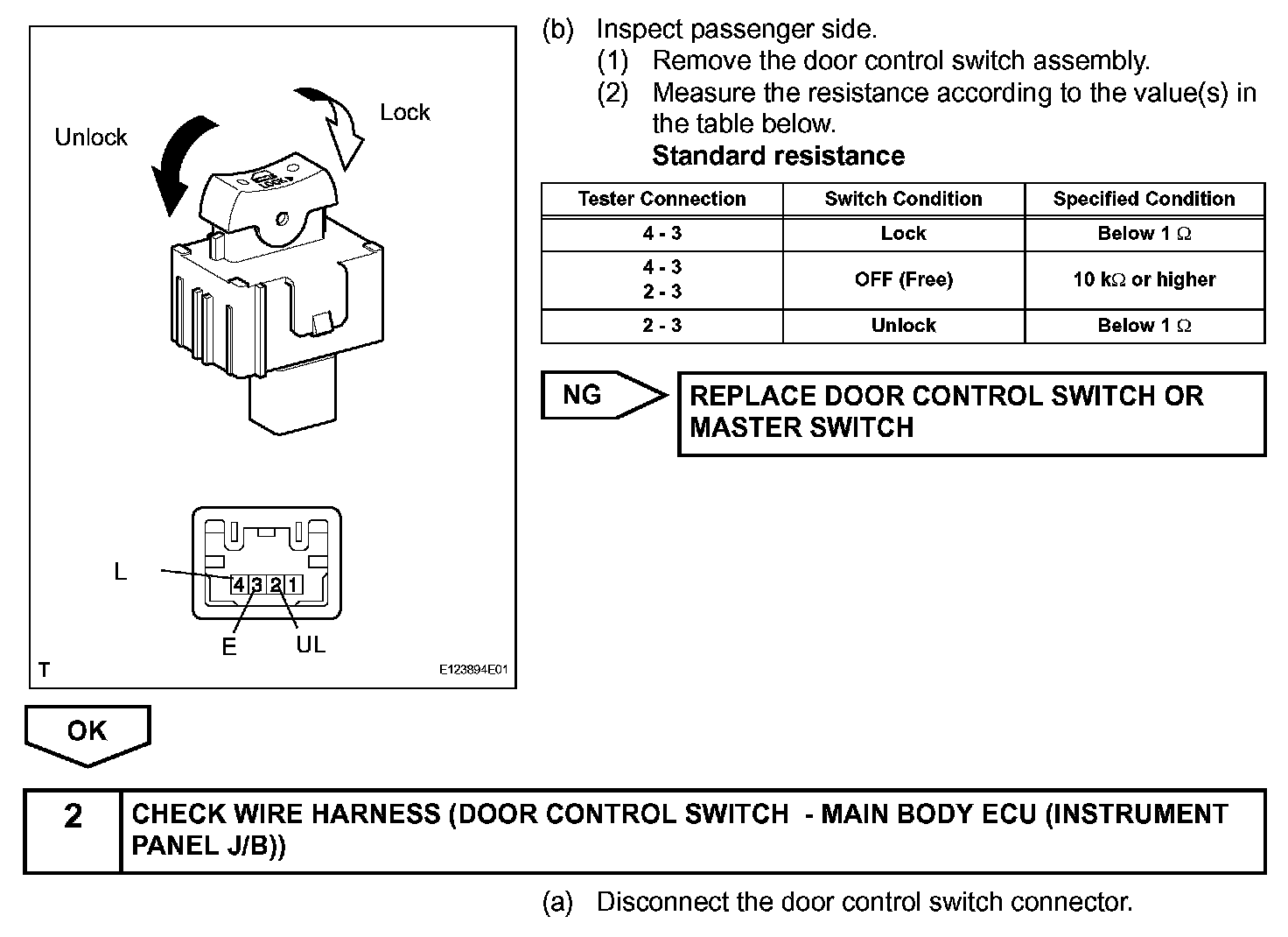 When the lock side of the door control switch is pressed, continuity is established between terminal 2 (driver side) or 4 (passenger side) and terminal 1 (driver side) or 3 (passenger side) of the switch. When
