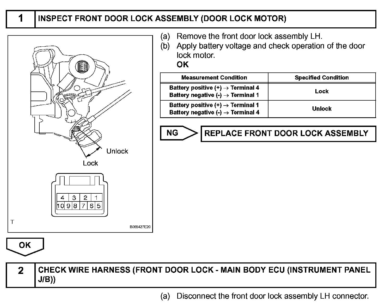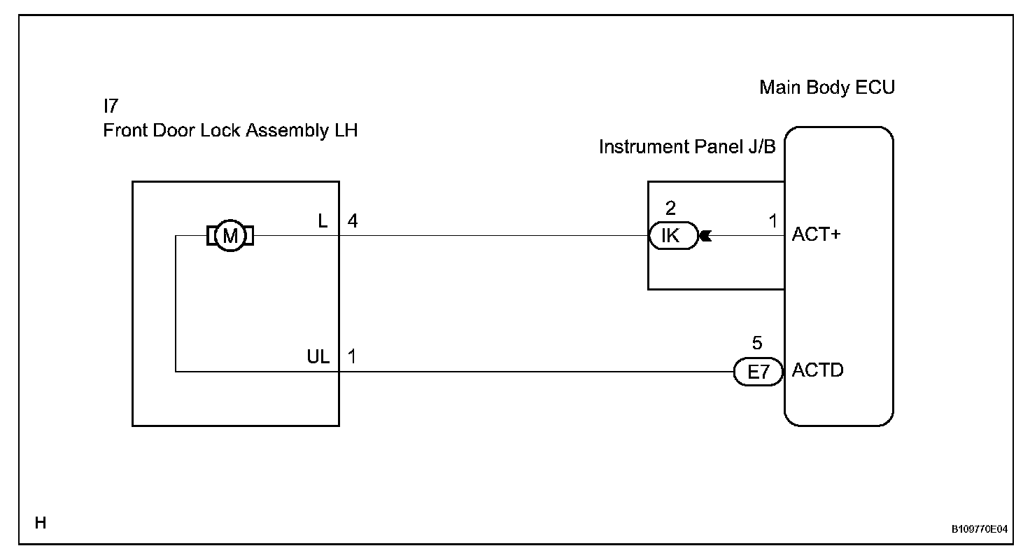 The driver's door lock motor is built into the driver's door lock assembly. The main body ECU controls the driver's door lock motor to lock/unlock the driver's door. This ECU applies current from terminal ACT+ to terminal ACTD to operate the motor to lock the door. It reverses the direction of the current flow to operate the motor to unlock the door.