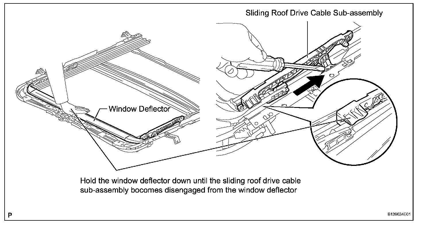 HINT: Hold the window deflector down, as shown in the illustration, until the sliding roof drive cable sub-assembly becomes disengaged from the window deflector.