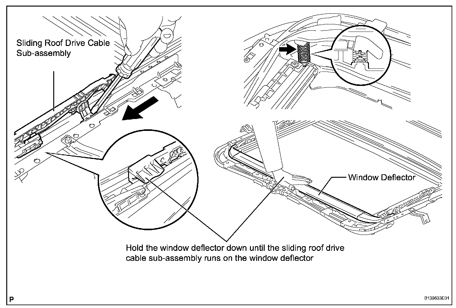 HINT: Hold the window deflector down, as shown in the illustration, until the sliding roof drive cable sub-assembly runs on the window deflector.