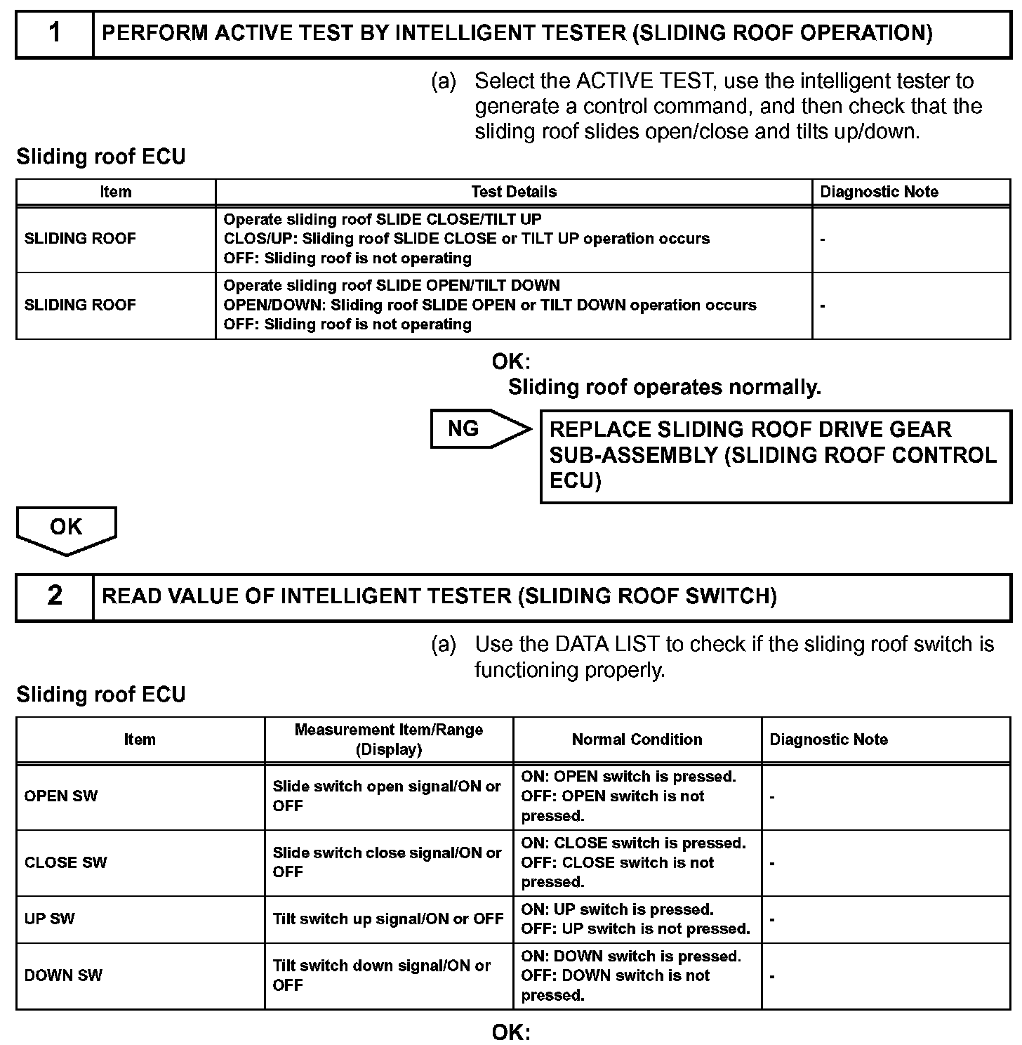 The sliding roof drive gear sub-assembly (sliding roof control ECU) receives slide switch and tilt switch signals and drives its built-in motor.