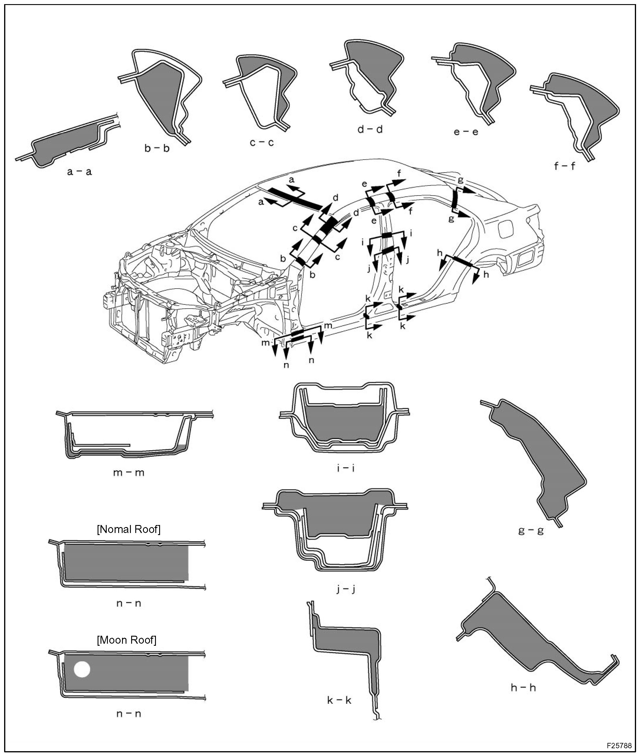 FOAMED MATERIAL APPLICATION AREASIf an increase in temperature or other condition damages the foamed material when repairing or replacing the panel, fill in the insufficient areas with urethane foam. The following illustration shows the areas for one side, but the foamed material must be applied equally to both the left and right sides.