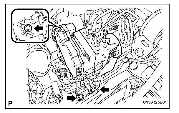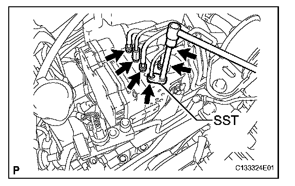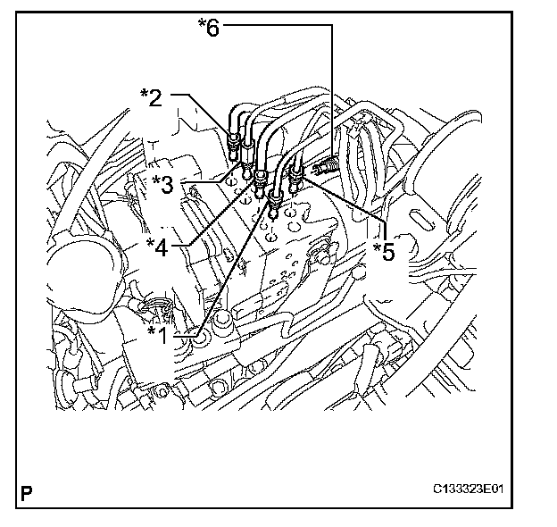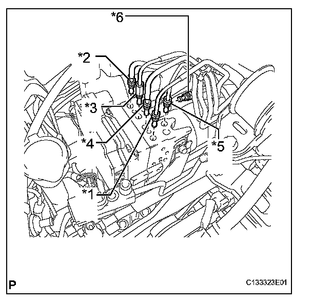 b. Using SST, disconnect the 6 brake lines from the actuator assembly with bracket.