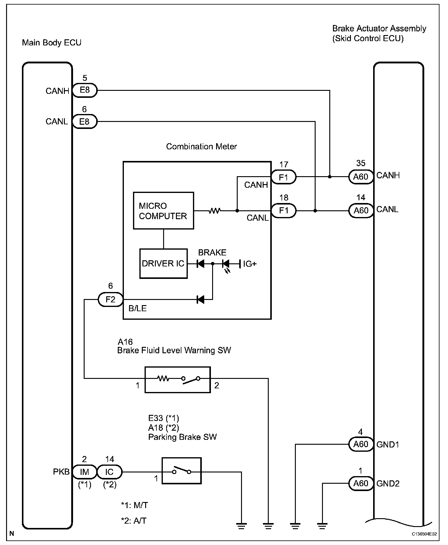 The skid control ECU is connected to the combination meter assembly via CAN communication.